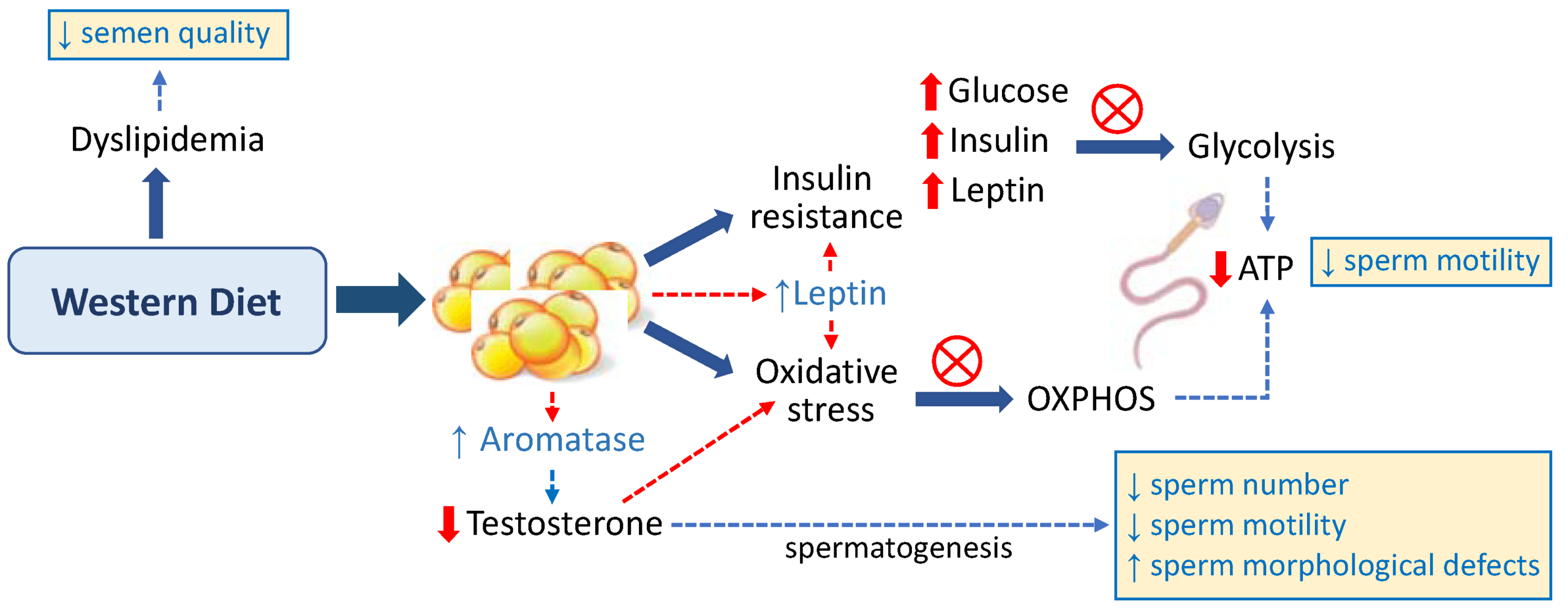 L’hyperinsulinémie et l’hyperglycémie, caractéristiques de la résistance à l’insuline, semblent responsables de la réduction de l’absorption et du métabolisme du glucose par les spermatozoïdes contribuant ainsi potentiellement à l’altération de la glycolyse dans ces cellules. Il est important de souligner que la glycolyse, associée à la phosphorylation oxydative (OXPHOS), est une voie métabolique produisant de l’adénosine triphosphate (ATP), principale source d’énergie des spermatozoïdes.