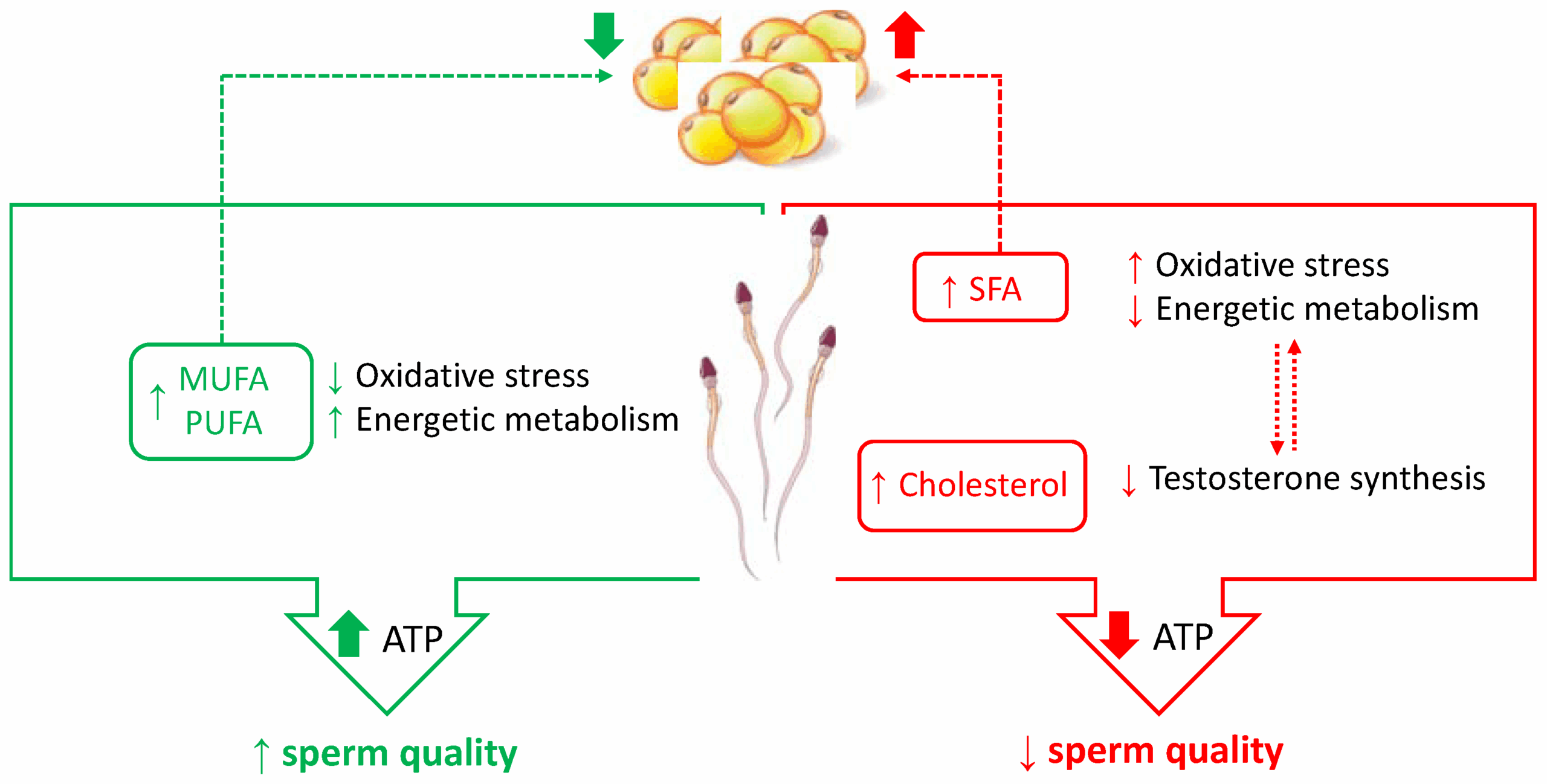 L’impact du cholestérol alimentaire sur la fertilité masculine reste mal compris au niveau moléculaire. On sait toutefois que le cholestérol est un lipide essentiel à la structure et à la dynamique des membranes spermatiques, ainsi qu’à la synthèse de la testostérone. En effet, les taux de cholestérol dans la membrane des spermatozoïdes influencent la fluidité membranaire, laquelle joue un rôle clé dans la motilité, la capacitation et la réaction acrosomique des spermatozoïdes.