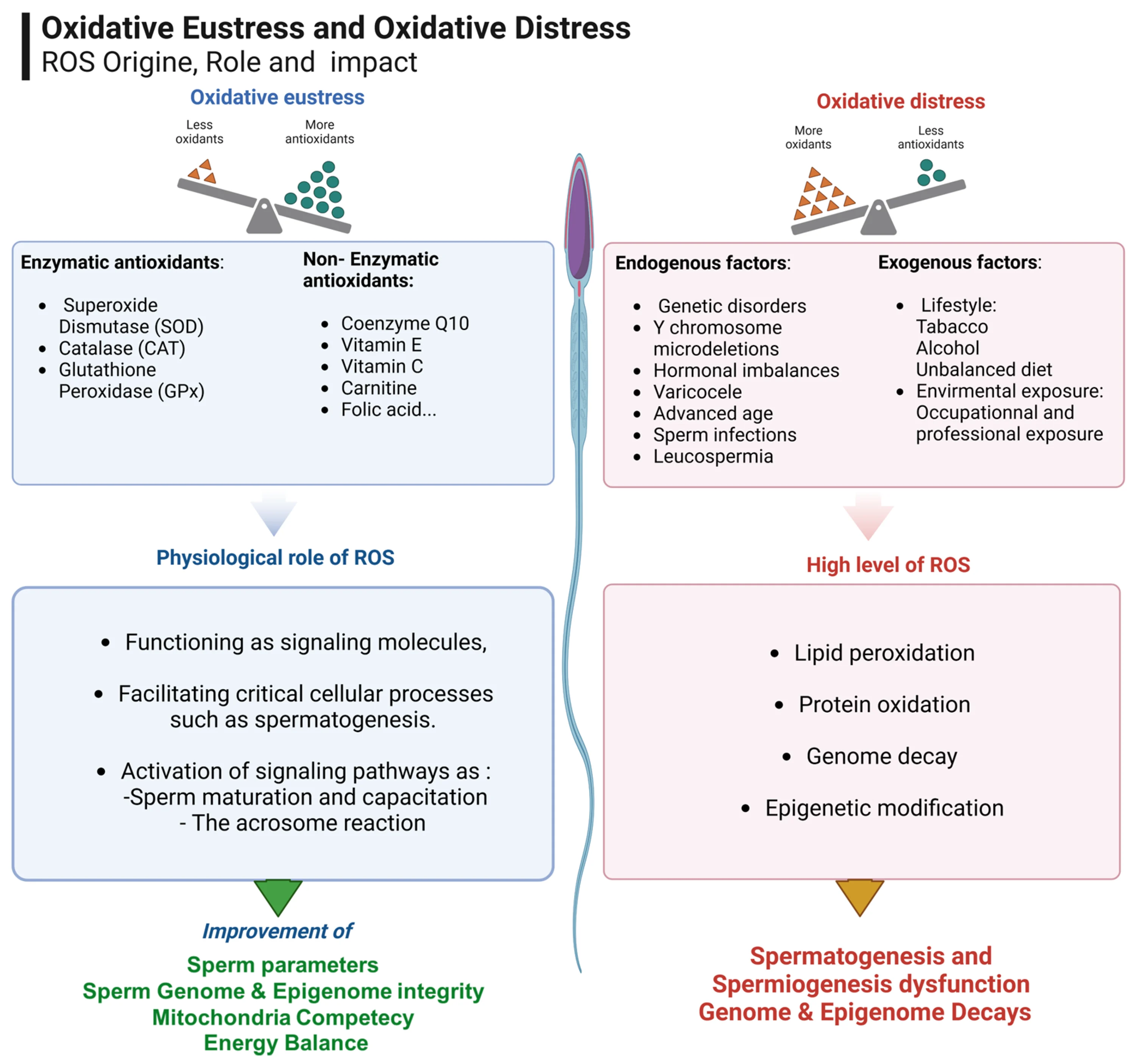Les anomalies des mitochondries des cellules de Leydig sont responsables de dommages oxydatifs aux lipides, aux protéines et à l’ADN mitochondrial (ADNmt), entraînant une diminution des niveaux d’ATP et une augmentation de la production d’espèces réactives de l’oxygène (ROS). Les cellules germinales et les spermatozoïdes matures sont sensibles au stress oxydatif, ce qui conduit à une diminution de la qualité du sperme (diminution du nombre et de la mobilité des spermatozoïdes et augmentation des anomalies morphologiques.